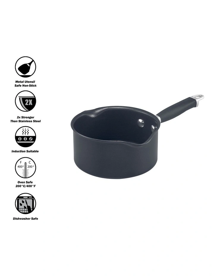Features: Sturdy, hard-anodised durability matched with steady, even heat distribution. Pro-grade construction for demanding home chefs and oven safe to 200°C. Dishwasher & metal utensil safe