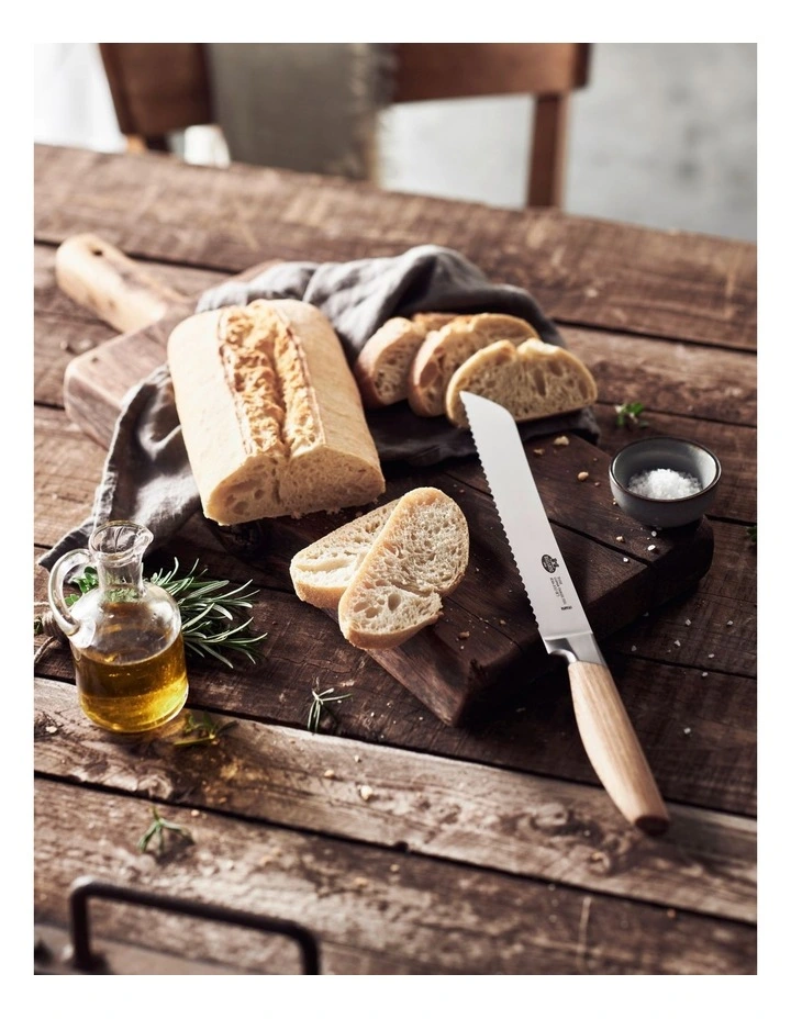The long serrated blade slices through food that is hard on the outside and soft on the inside, such as a sourdough loaf.