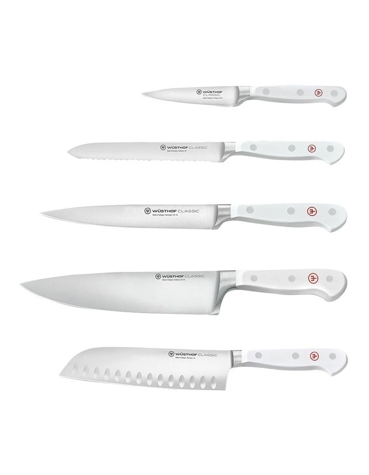 - 1x Paring Knife 9cm, 1x Sausage Knife 14cm, 1x Utility Knife 12cm, 1x Santoku Knife 17cm, 1x Cook’s Knife 20cm, 1x Design Knife Block