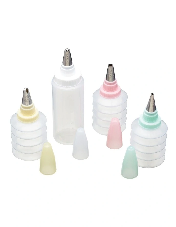 This 4-piece cookie and cupcake decorating kit is designed to add decorating touches to your homemade cookies, cakes and cupcakes. The set comes complete with four easy to squeeze icing bottles, a selection of durable stainless steel nozzles and lids for storing left over icing. Everything you need to bring your cake decoration to perfection.