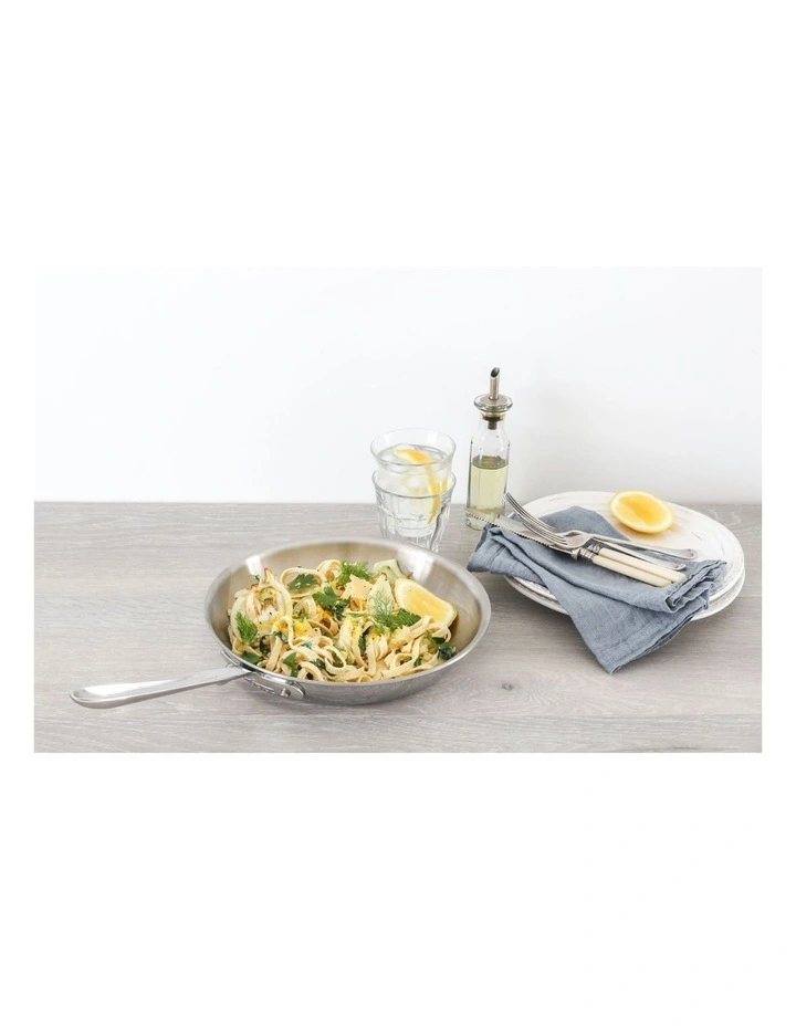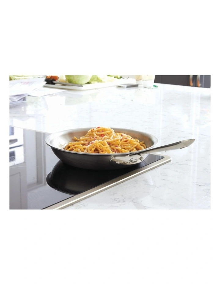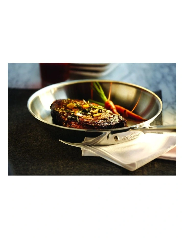 A true kitchen staple, the All-Clad d5 STAINLESS Polished frypan is great for searing, browning, and pan-frying. Its flat bottom and flared sides make for easy tossing or turning with a spatula. The pan accommodates cooking at higher heat with oils to develop foods with full flavor, color, and crisp texture. The only cookware of its kind, All-Clad d5 STAINLESS features a patented technology of five alternating layers of responsive aluminium and durable heat-diffusing stainless steel. d5 STAINLESS cookware heats slowly and evenly, which means perfectly browned proteins throughout, from the center all the way to the edge.