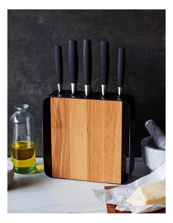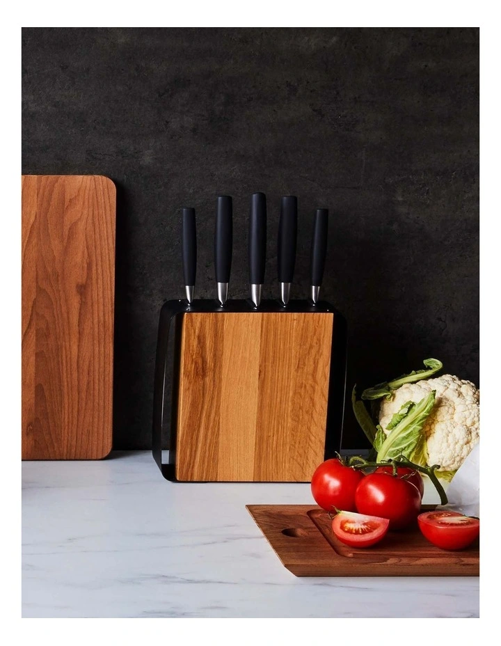 Constructed from acacia wood with a matte black metal frame, this block is designed to store knives safely whilst keeping them in excellent condition. The block houses the five essential knives to cover all cutting tasks in the kitchen.