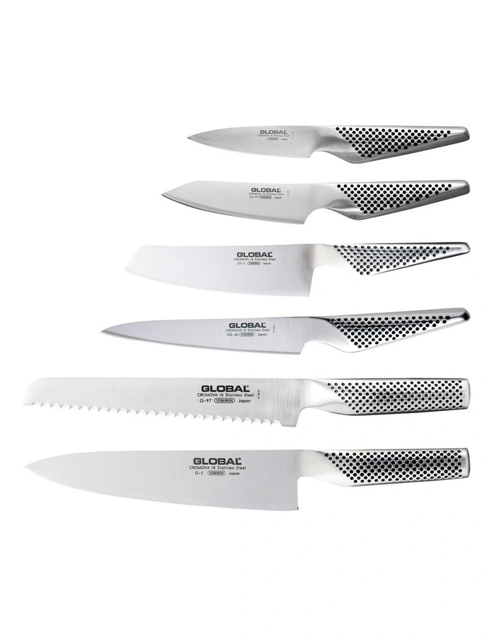 The 7 Piece HASHIRA Knife Block set includes our 6 best selling knives, all housed in an elegant maple storage block. This knife block features a clear acrylic window at the front which not only allows your knife to be stored safely, but also allows the knife blades to be on display in the kitchen. GLOBAL knives are made from CROMOVA 18 stainless steel, specially developed by GLOBAL as it holds a razor-sharp edge and resists rust, stains and corrosion. Ice tempered and hardened to Rockwell C56-58, each knife is carefully weighted for optimum performance and balance. Other unique features include its smooth contours and seamless construction which eliminates food and dirt traps offering the ultimate in safety and hygiene. The acute 15-degree angle cutting edge provides unsurpassed performance and superior edge retention. The name HASHIRA (R) translate to Pillar in Japanese as the storage block resembles a vertical structure which supports the knives. When purchasing any GLOBALknife block set, we strongly recommend investing in a ceramic water sharpener or whetstone in order to maintain your knives and keep them razor sharp.