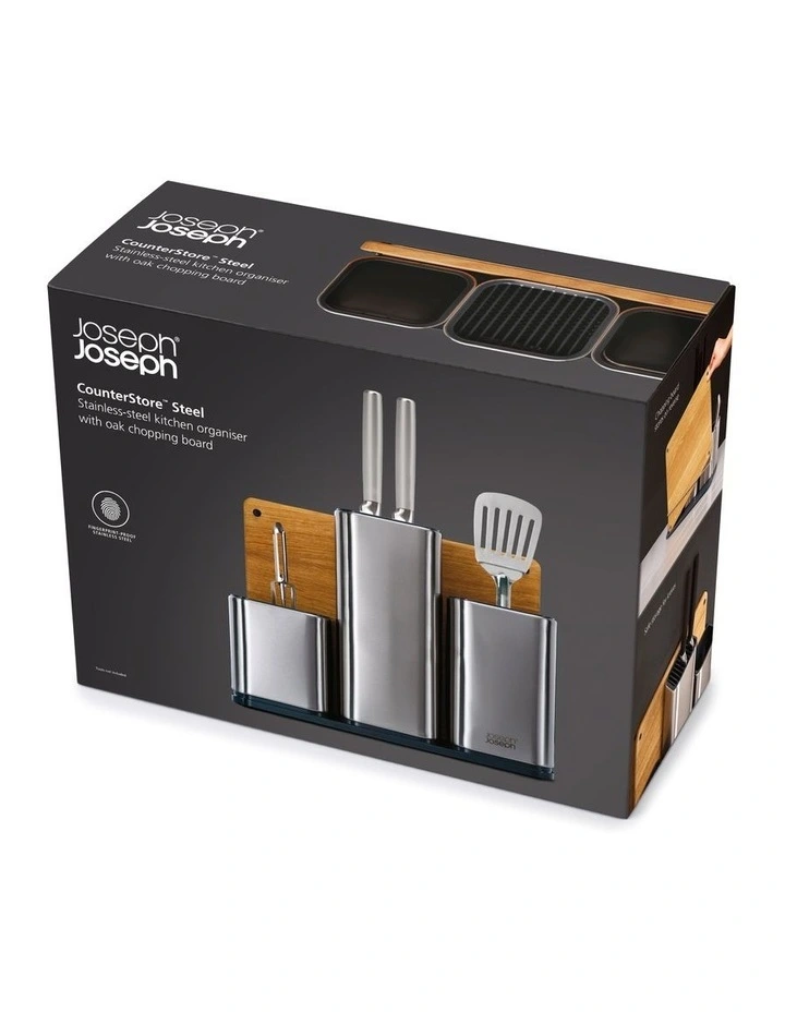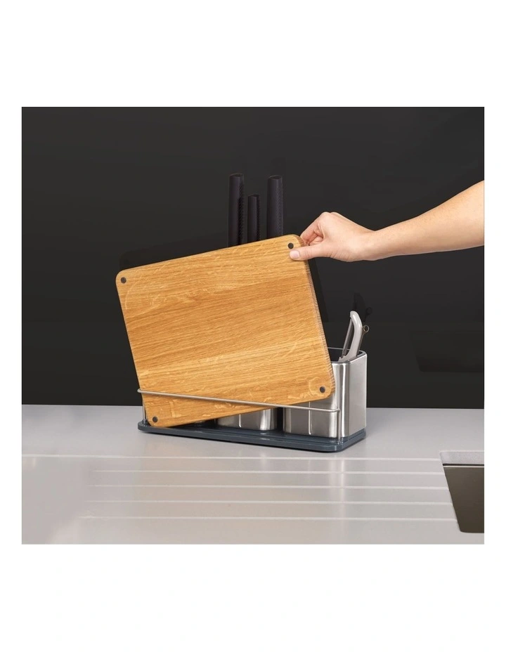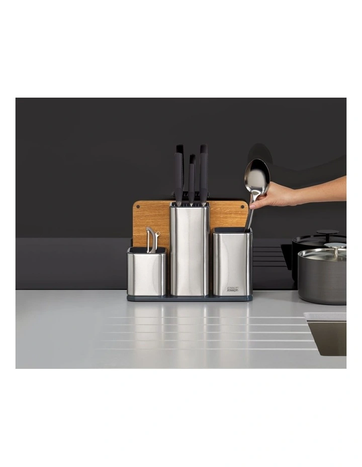 With limited space in many kitchens, this compact worktop organiser allows you to store knives, gadgets and utensils in one convenient place. The design features separate compartments for each tool type and includes a central knife store with non-scratch slots that grip blades safely and securely. It also comes with its own non-slip, oak chopping board that stores neatly at the back. Made from durable stainless-steel.Â