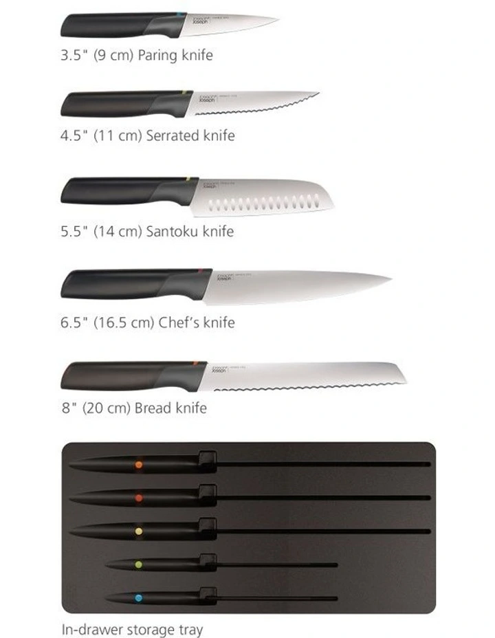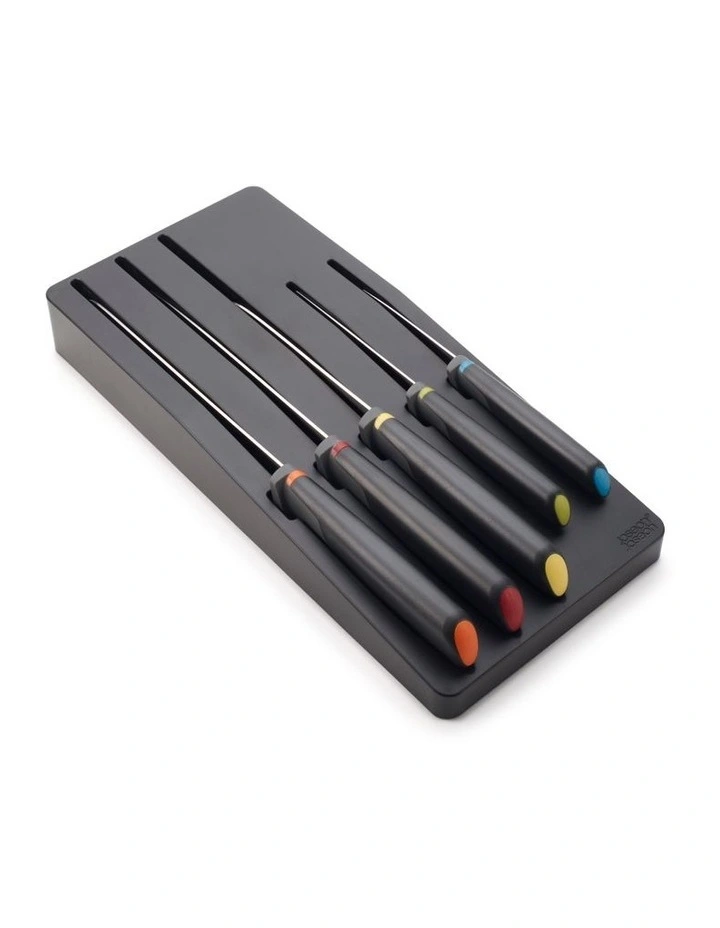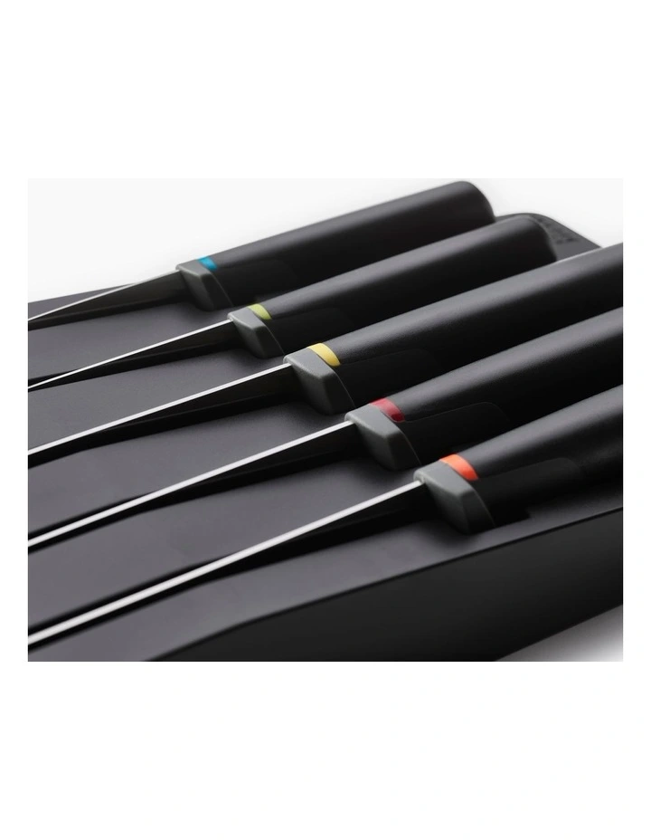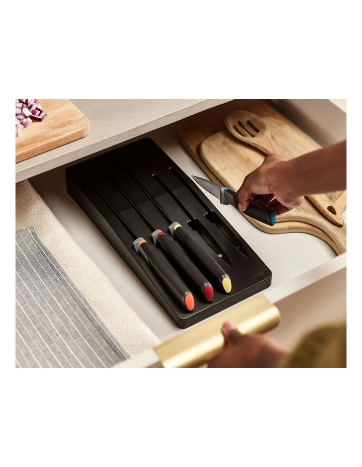 Elevate technology has been designed to improve hygiene and minimise the mess made by placing tools onto kitchen surfaces during use. Each knife has a weighted handle with an integrated tool rest that prevents the blade from touching the work surface when placed down. This 5-piece set features knives with Japanese stainless-steel blades and ergonomic, colour-coded handles, plus an in-drawer tray for organised storage. The tray features corresponding coloured dots for quick and easy storage and a non-slip base.