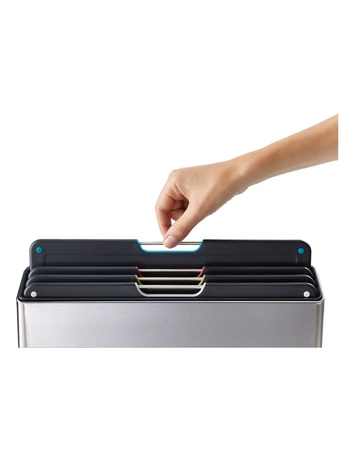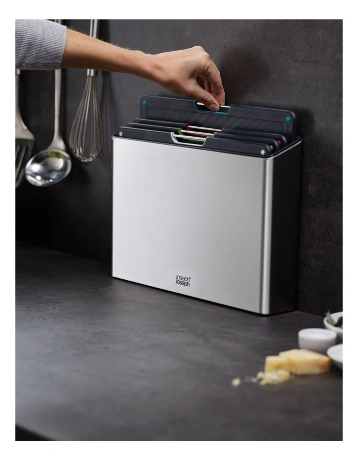 This stunning design features a slimline, stainless-steel case that keeps four large chopping boards beautifully organised and makes a real statement on the worktop. Each colour-coded board has a knife-friendly, textured cutting surface on both sides and non-slip feet. They can be easily removed from the case due to the smart angled design and stainless-steel selecting bars.
