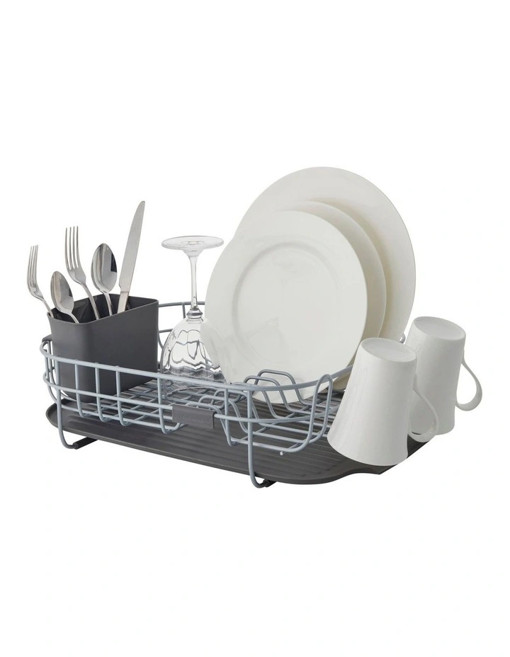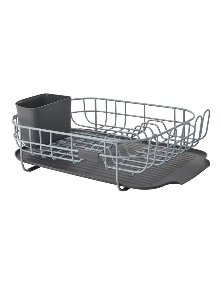 Add more drying space as needed with this KitchenAid Dish Rack. The wire frame rack is constructed of metal with a rust-resistant, satin grey finish and includes slots for dishes and a removeable utensil holder.