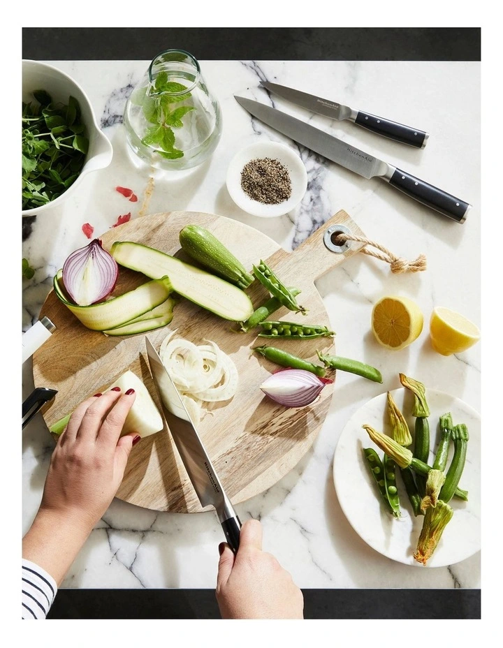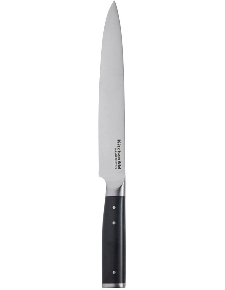 Get inspired in the kitchen with the KitchenAid Gourmet 20cm carving knife. This practical knife is light and strong, expertly forged from semi-polished, high-carbon Japanese steel, hardened and tempered for superior strength and a longer-lasting edge. Designed with a thin blade, the carving knife is perfect for slicing the perfect cut of meat – an essential for any home chef. Includes a sheath to keep your blade secure and protected during storage.