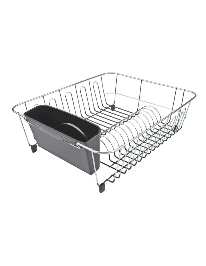 This Dish Drainer from d.line Practical Storage Solutions conveniently holds dishes, glasses, flatware and pans. It’s PVC coated base cushions dishes and includes a detachable cutlery compartment caddy.