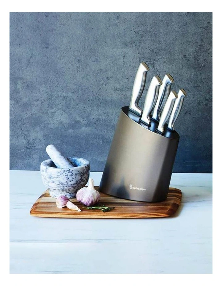 Co-ordinate with your appliances or just add a beautiful colour to your bench top with this beautiful metallic mocha knife block. The block houses the five essential knives to cover all cutting tasks in the kitchen.