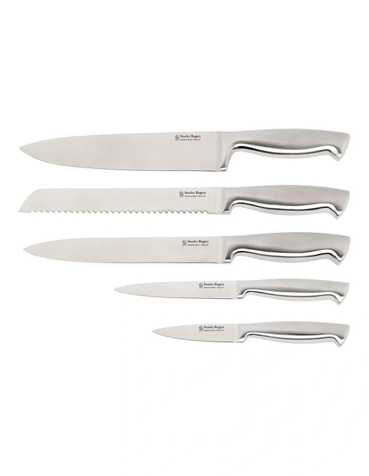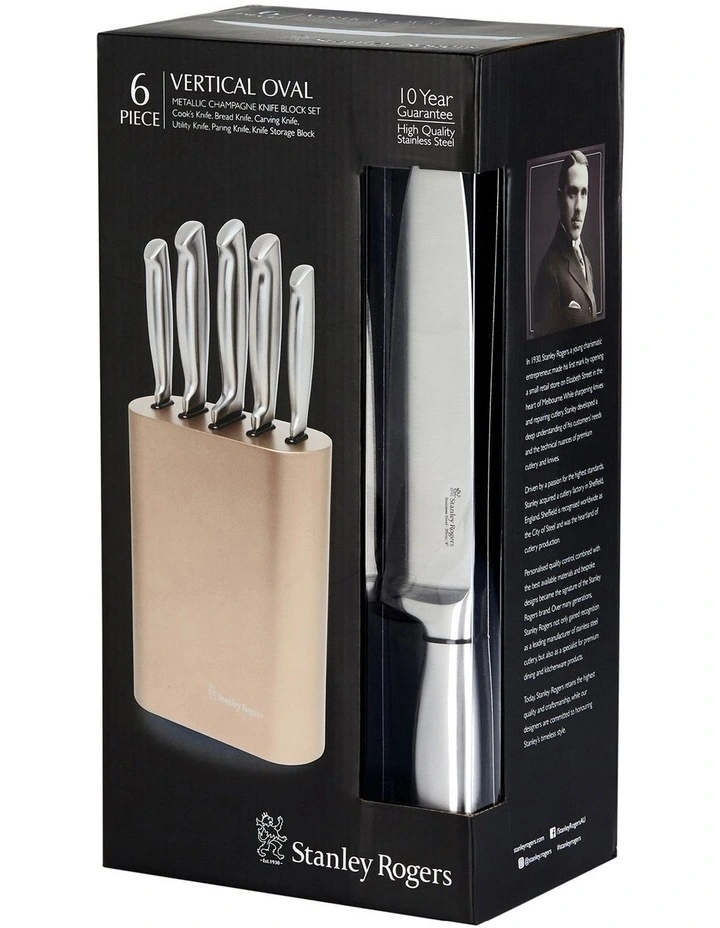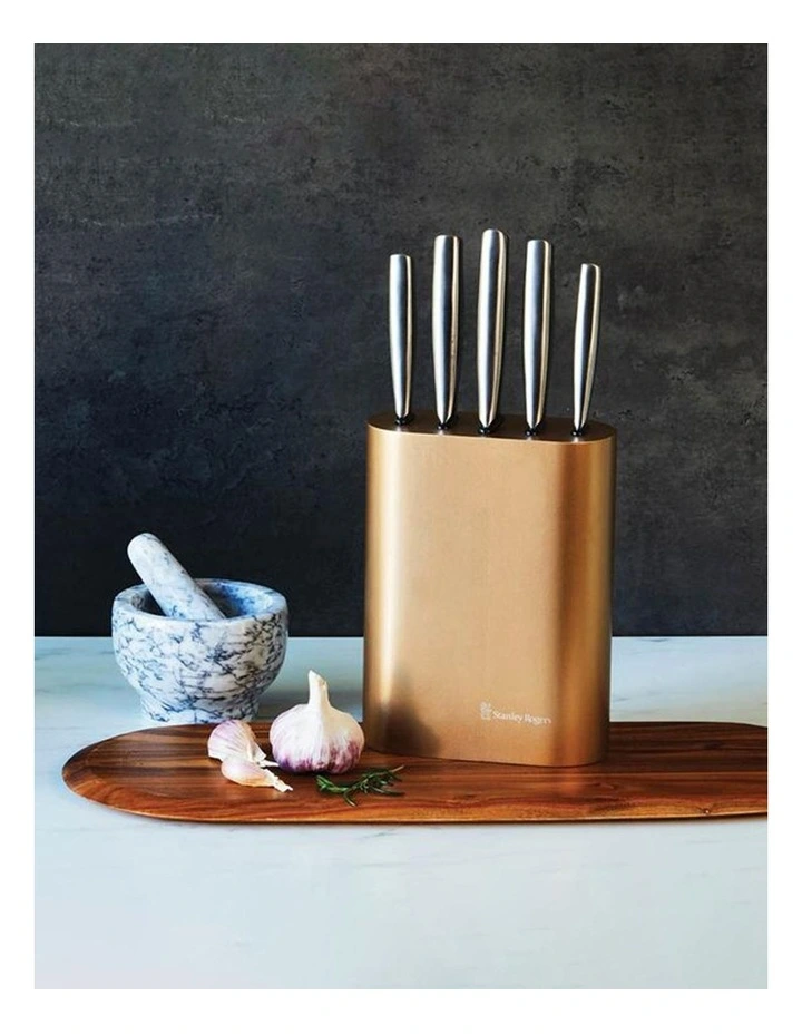 Co-ordinate with your appliances or just add a beautiful colour to your bench top with this beautiful metallic champagne knife block. The block houses the five essential knives to cover all cutting tasks in the kitchen.