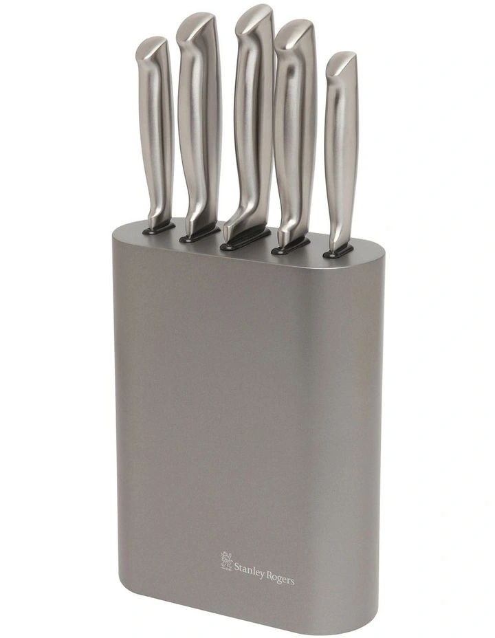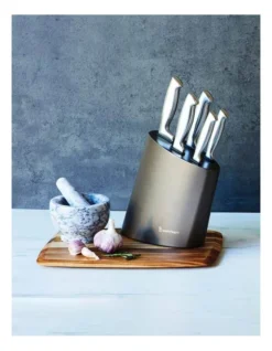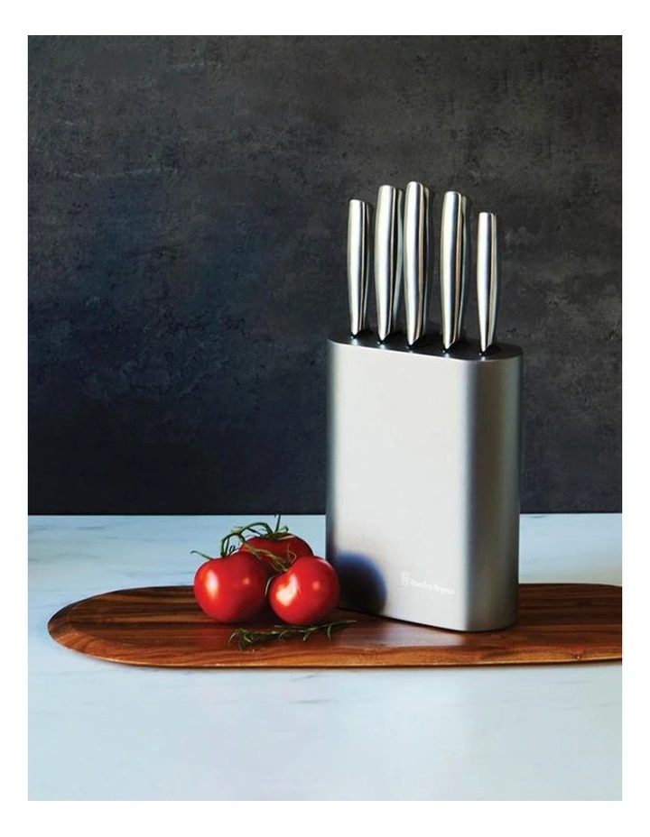 Co-ordinate with your appliances or just add a beautiful colour to your bench top with this beautiful metallic pewter knife block. The block houses the five essential knives to cover all cutting tasks in the kitchen.