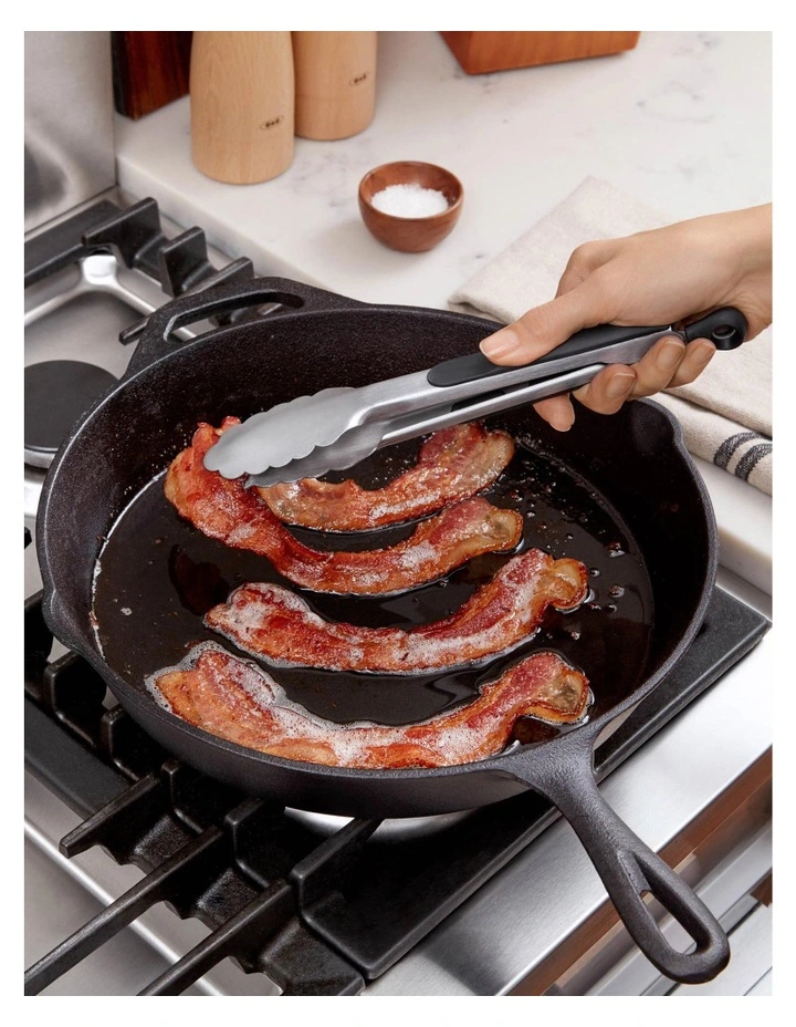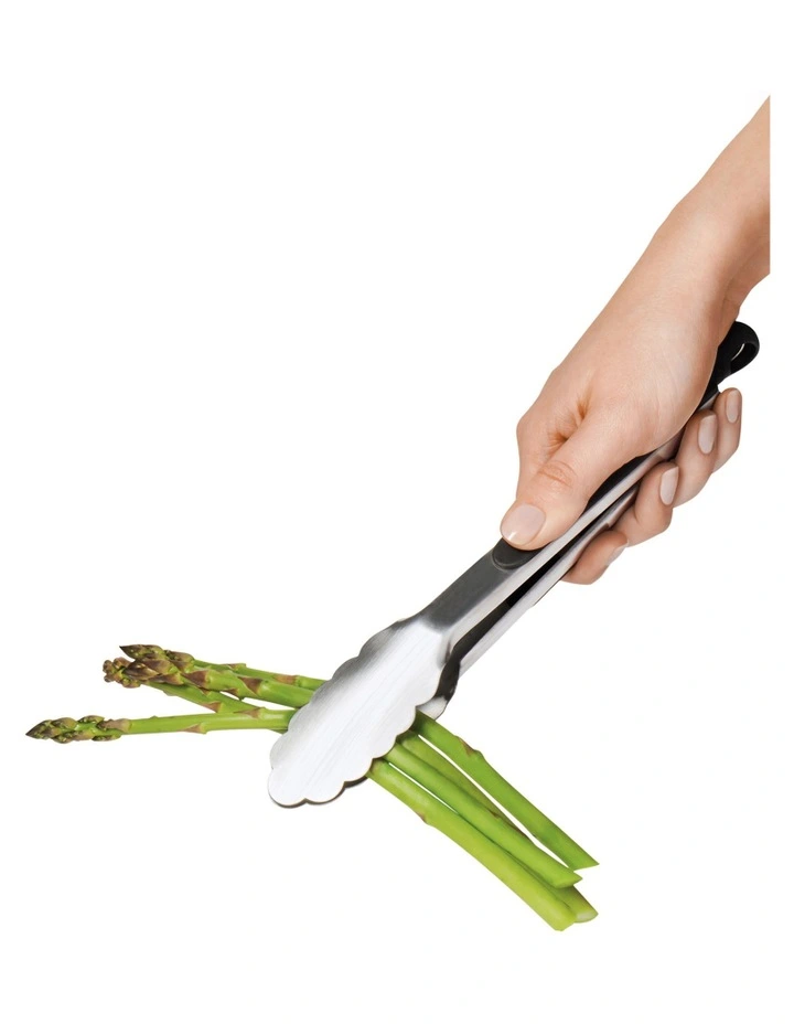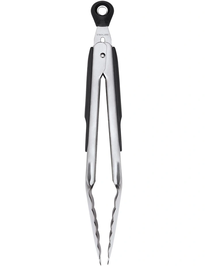 The OXO Good Grips tongs feature brushed stainless steel with soft, non-slip handles and comfortable thumb rests. Easily lock in the closed position for convenient storage. The large pull-tab for locking also doubles as a hole for hanging. Also available in 30cm and 41cm sizes.