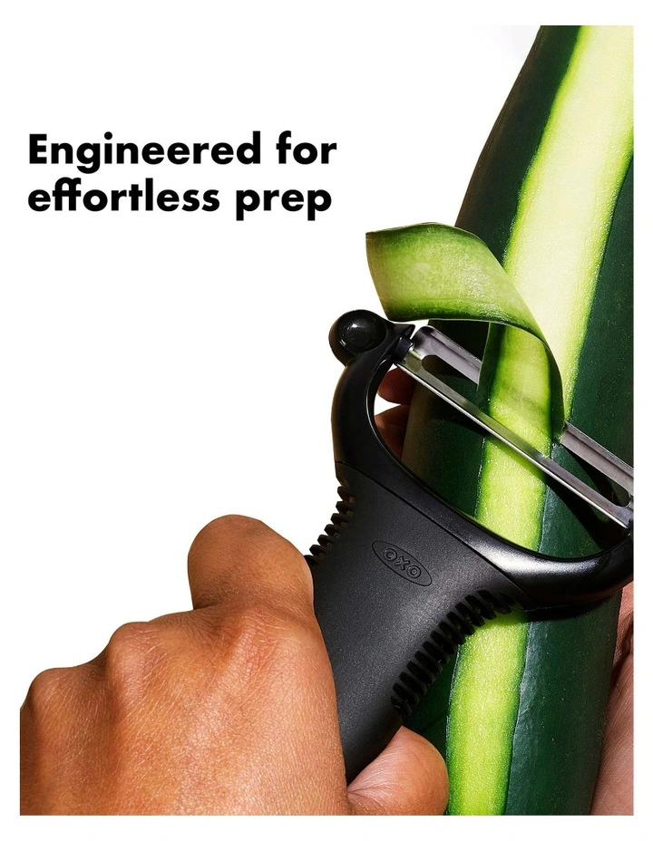 - Sharp, hardened stainless steel blade easily peels cucumbers, apples and more