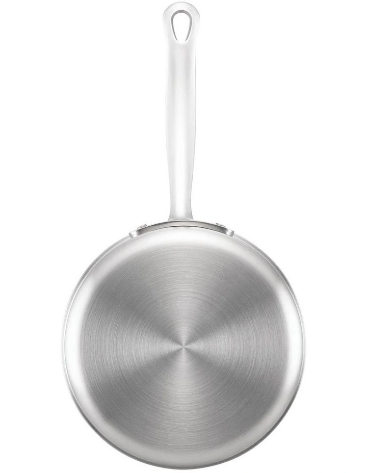 Fast-heating aluminum is bonded between two stainless steel layers to efficiently heat the entire pan at once, so food is cooked evenly every time.