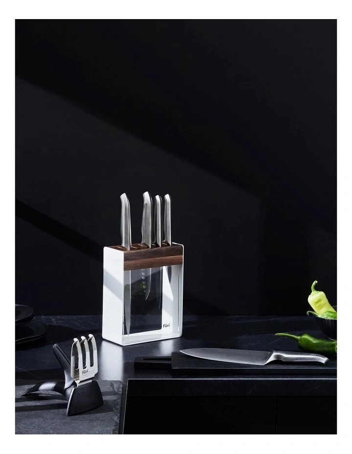The Furi Pro Limited Edition 7 Piece Knife Block is the quintessential knife set which leads the way in taking the chore out of meal preparation. The knives are neatly housed in a contemporary, Australian designed, knife block. Crafted from black walnut with a matte white steel frame, the block houses 5 knives. All blades are made with a high carbon Japanese stainless steel alloy, for a knife that holds its edge for longer whilst remaining easy to sharpen.
