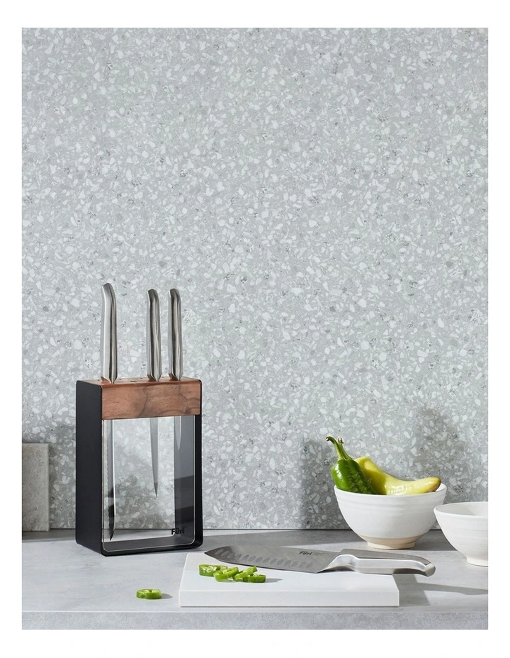The Furi Pro Limited Edition 5 Piece Knife Block is the quintessential knife set which leads the way in taking the chore out of meal preparation. The knives are neatly housed in a contemporary, Australian designed, knife block. Crafted from black walnut with a matte black steel frame, the block houses 4 knives.
