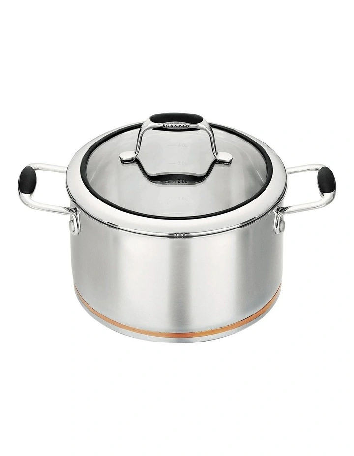 This SCANPAN Coppernox 24cm/4.8L dutch oven expands on traditional cookware with its unique construction. The base is impact bonded with a copper wedge for rapid and even heat distribution. To assist with heat retention and elimination of hot spots, the copper wedge is enveloped by 2 layers of aluminium with stainless steel surrounding the entire piece. This combination provides optimal heat diffusion and control. The sturdy lid with stainless steel rim and tempered glass insert allows you to view the cooking process. The range features cast stainless steel handles with soft touch and comfortable silicone inserts and a internal mirror polished 18/10 stainless steel finish with capacity markings. The range is suitable for all energy sources, including induction. It is oven safe to 220C.