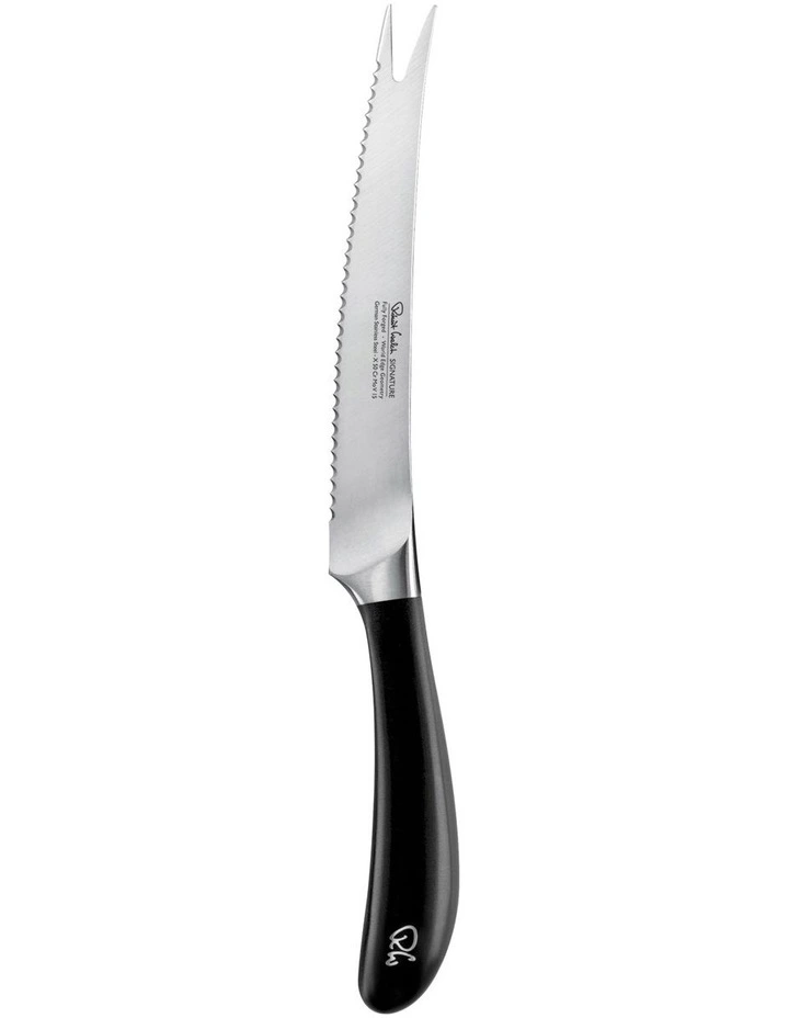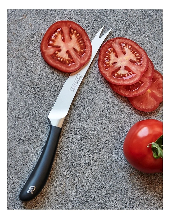 Robert Welch’s SIGNATURE 14cm serrated tomato knife features a pronged tip for picking up slices and a scalloped edge for cutting citrus fruits and other foods with a hard rind or tough skin. Designed in consultation with professional chefs, this award winning kitchen knife features a fully forged German DIN 1.4116 stainless steel blade with a full tang for extra strength.