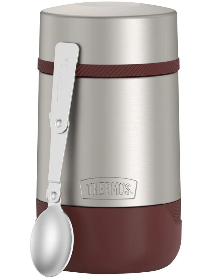 Thermos vacuum insulation technology for maximum temperature retention, keeps hot up to 9 hours or cold up to 22 hours. Durable stainless steel interior & exterior. Cool to touch with hot liquids, sweat proof with cold. Integrated, full size, stainless steel foldable spoon fits securely in lid. Wide mouth is easy to fill, eat from and clean. Removable bowl for extra storage or serving.