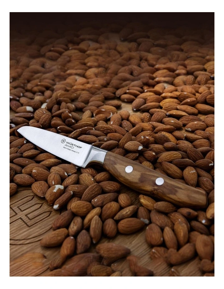 The WUSTHOF Amici Paring Knife is the perfect tool for small and precise cuts, like finely slicing a clove of garlic, peeling potatoes or coring apples for pie. The short, precision-sharpened blade makes intricate chopping and manoeuvring a simple, accurate process. Also, a full bolster, the thicker area between the blade and the handle on forged knives offers added protection for your fingers. The custom-grained Calabrian olive wood handle is naturally water-resistant, antibacterial and its organic shape fits comfortably in hands of any size.