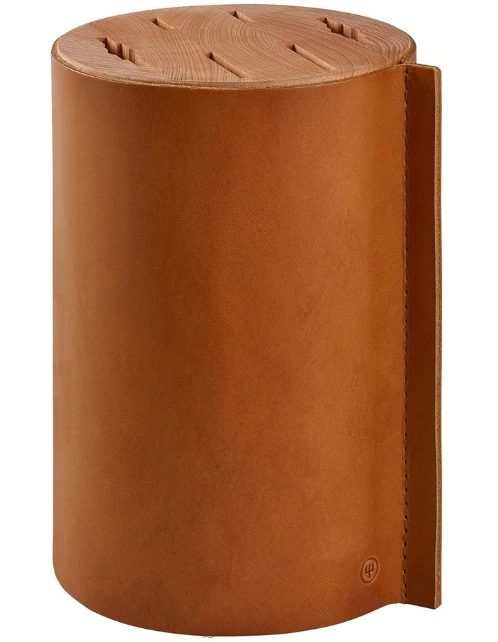 The round, leather-bound WUSTHOF Amici Villa Knife Block can safely and stylishly store up to six knives (with a maximum blade length of 23cm). The Italian-leather side stitching subtly magnifies the beauty of the Amici series characteristic olive wood handles and the premium beechwood acts as a stable, non-slip base for expertly storing your blades between meals.
